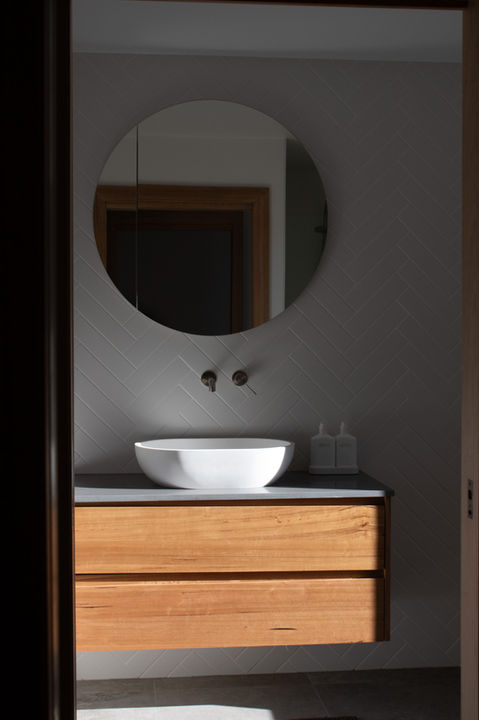 Anchored by a dramatic recycled brick wall—crafted from handmade bricks salvaged from a neighbouring milk factory—the home centres around a double-sided Cheminees fireplace atop a concrete plinth. Featuring hydronically heated concrete floors, Tasmanian Oak joinery, and bespoke locally crafted elements, every detail has been meticulously considered.